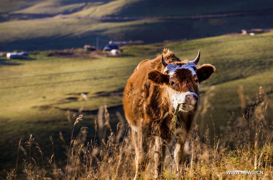 A head of cattle eats grass at a scenic spot in Qitai County of northwest China's Xinjiang Uygur Autonomous Region, Sept. 30, 2016. (Xinhua/Wang Fei)
