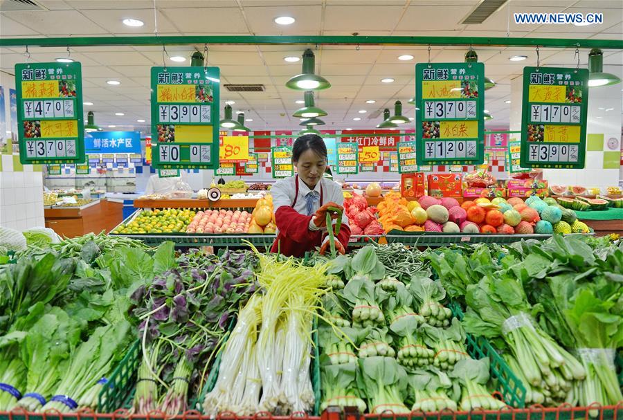 A saleswoman arranges vegetables at a supermarket in Cangzhou City, north China's Hebei Province, Oct. 13, 2016. China's consumer price index (CPI), a main gauge of inflation, grew 1.9 percent year on year in September, up from 1.3 percent in August, the State Bureau of Statistics announced on Friday. (Xinhua/Mou Yu)