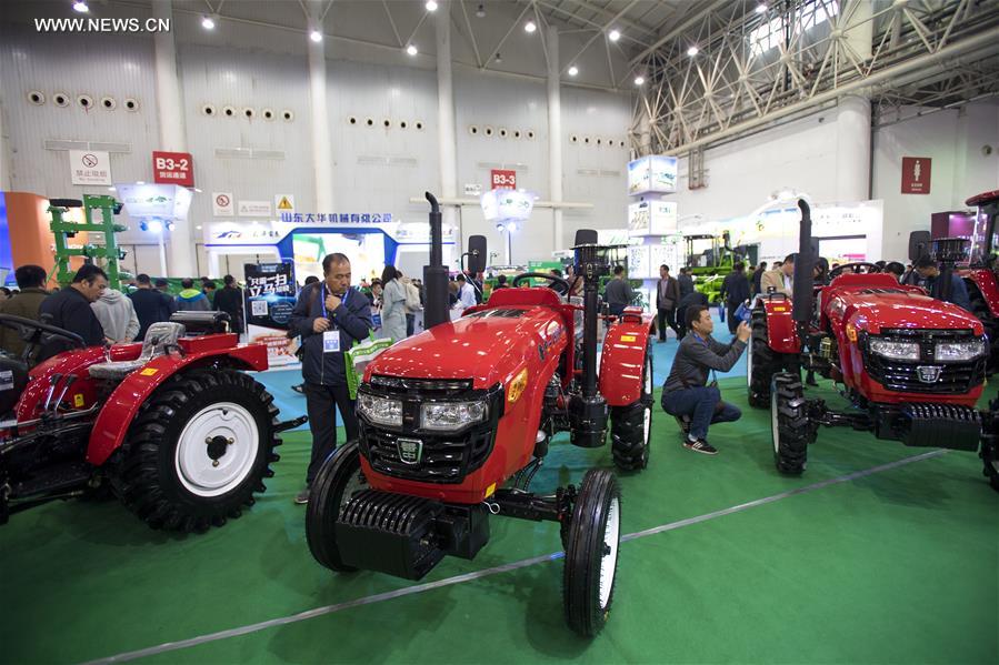 Visitors view tractors during the 2016 China International Agricultural Machinery Exhibition in Wuhan, capital of central China's Hubei Province, Oct. 26, 2016. About 1,900 companies took part in the exhibition held at Wuhan International Convention and Exhibition Center. (Xinhua/Xiong Qi)