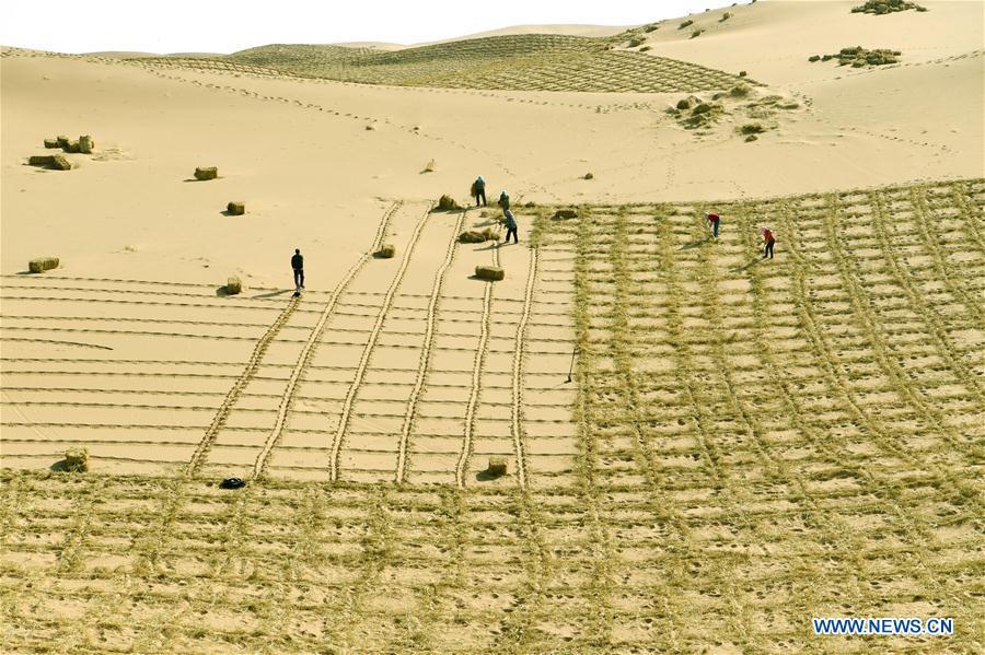 Farmers build barriers with hay to create grid patterns that stabilize sand dunes in Minqin County, Wuwei, northwest China's Gansu Province, Nov. 19, 2016. Local government planned to spend six years from 2015 to build an ecological barrier to stabilize sand and prevent desertification, which is 500km long and 1000 meters wide. (Photo/Xinhua)