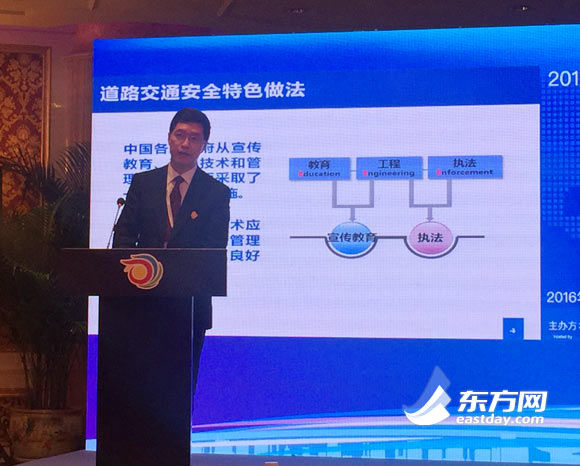 Wang Changjun, director of the Traffic Management Research Institute under the Ministry of Public Security, delivers a speech at the "Road to Safer Cities" session of the 9th Global Conference on Health Promotion in Shanghai on Nov. 21, 2016. (Photo/eastday.com)