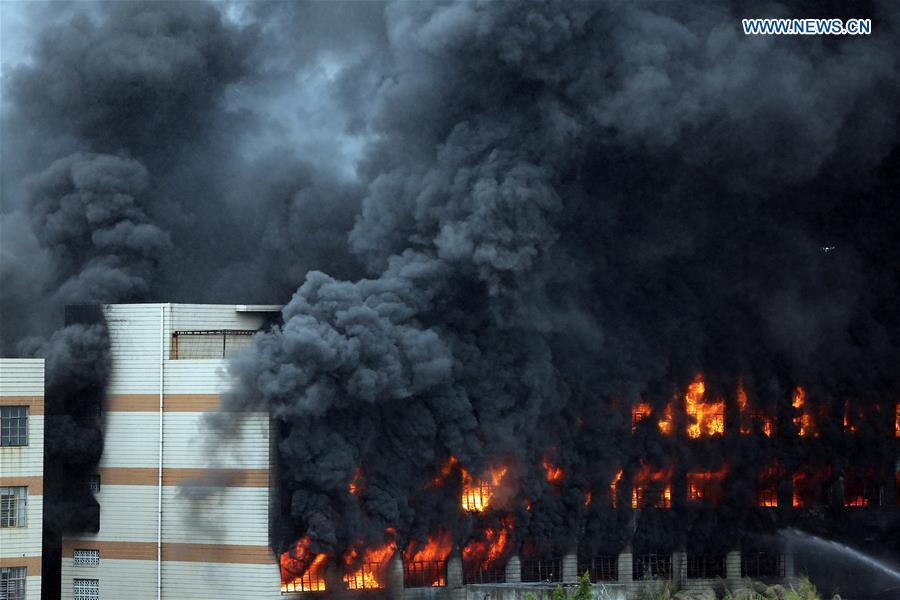 Photo taken on Nov. 26, 2016 shows the factory that caught fire in Quanzhou, southeast China's Fujian Province. A factory in Quanzhou caught fire on Saturday noon, and no casualty has been reported. (Xinhua)