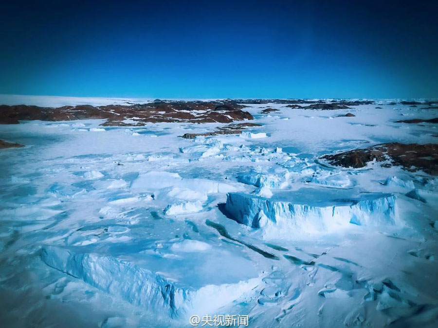China's icebreaker Xuelong (Snow Dragon) arrives in Antarctica on December 5, 2016 after a one-month trip. The Chinese research vessel and icebreaker, which is on its 33rd Antarctic expedition, has made a stop at an ice zone nearly 31 kilometers away from Zhongshan Station. The expedition team has sent helicopters to explore the way through the ice in order to find the safest approach to Zhongshan Station. [Photo: Weibo account of CCTV News/Yang Litian]