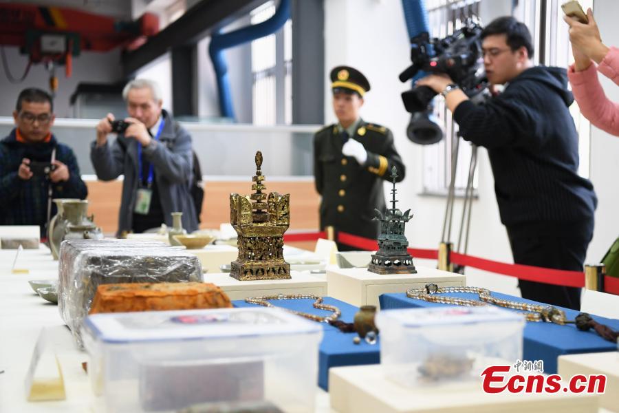 Relics unearthed from the ancient Qinglong Township ruins are seen in Shanghai, east China, Dec. 8, 2016. Shanghai Museum on Thursday introduced the latest discovery since the excavation of the ruins in 2010. The Qinglong Township ruins is located in today's Baihe Township of Qingpu District in Shanghai, and documents recorded it as an important trade port in Tang (618-907) and Song (960-1279) Dynasties. In recent years, more than 6,000 restorable porcelain works and tens of thousands of broken porcelain pieces from nearby provinces were found in the ruins, which offers new evidence that Qinglong Township was an important port along the Maritime Silk Road. Besides, the discovery of the Longping temple, pagoda and its terrestrial palace in 2015 and 2016 helped the researchers to study the layout of the township as well as the history of China's ancient buildings and Buddhism. (Photo: China News Service/Zhang Hengwei)