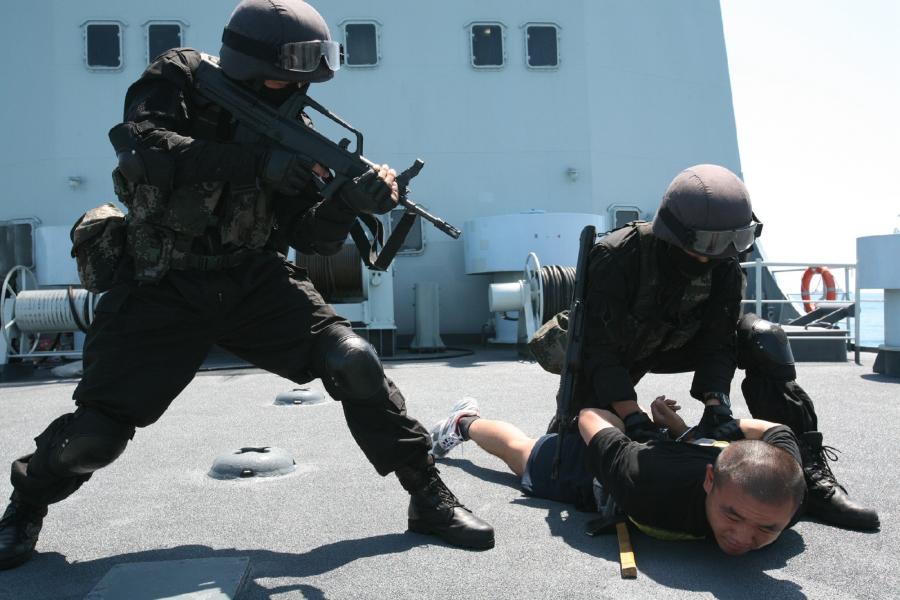 A mock terrorist is under arrest by two naval special operations soldiers on the deck of a warship during a simulated maritime anti-terrorist rescue action. A special operations regiment of the PLA navy conducted a year-end training exercise in early December to test the troops' capablities. (81.cn/ Sun Hongtao, Li Youtao)