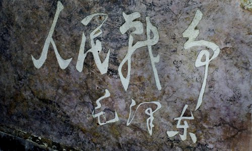 The slogan "People's war" written in Mao Zedong's handwriting is seen on the wall of an air defense tunnel.