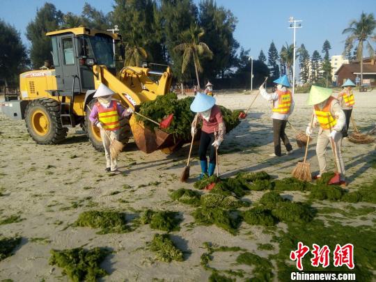 The well-known Silver Beach scenic spot in Beihai, Guangxi Zhuang Autonomous Region was recently converted into a "green beach" by algae. Sanitation workers have cleared 135 tons of green algae in just five days, China News reported on Jan. 5.