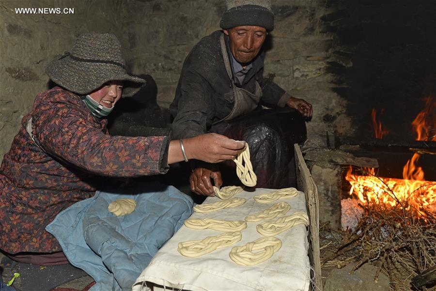 People make "Kasai", a traditional Tibetan food, to greet the upcoming Tibetan New Year, or Losar, in Qonggyai County of Shannan, southwest China's Tibet Autonomous Region, Feb. 3, 2017. (Xinhua/Liu Dongjun)