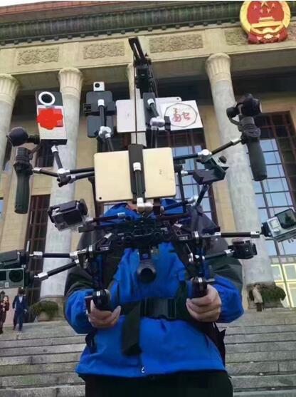 A reporter with Guangming Online carrying an almost 15-kilogram “Iron Man” multichannel live broadcast cloud platform outside the two sessions. (Photo from WeChat account)