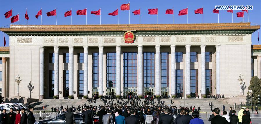 Photo taken on March 12, 2017 shows the Great Hall of the People in Beijing, capital of China. The third plenary meeting of the fifth session of the 12th National People's Congress opened in Beijing on Sunday. (Xinhua/Fei Maohua)