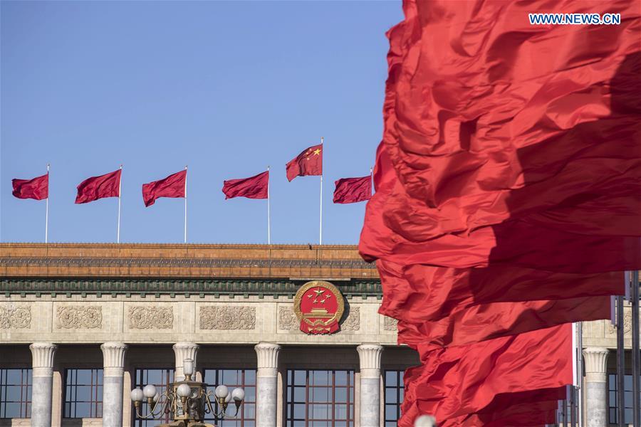 Photo taken on March 12, 2017 shows red flags at the Tian'anmen Square in Beijing, capital of China. The third plenary meeting of the fifth session of the 12th National People's Congress opened in Beijing on Sunday. (Xinhua/Fei Maohua)