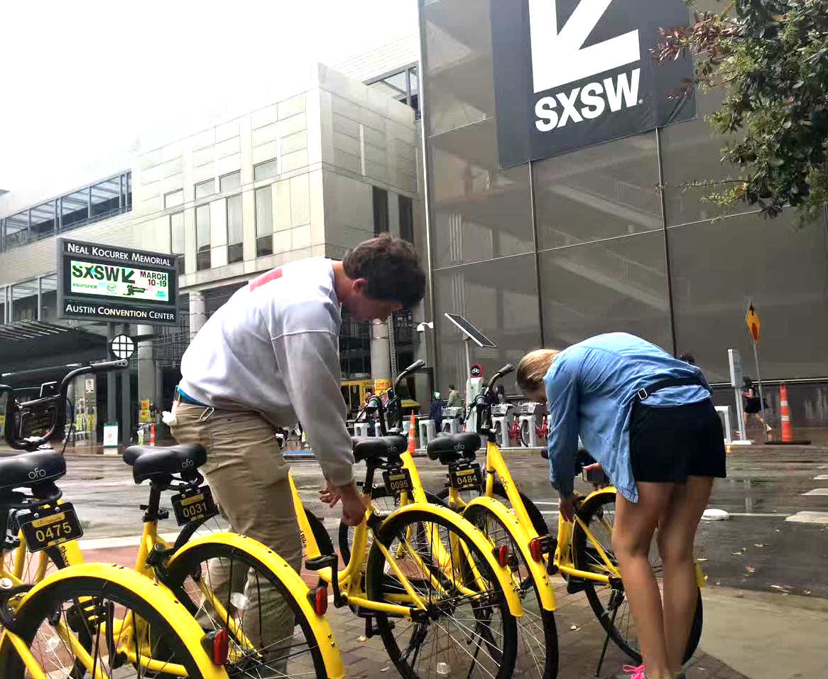Users unlock ofo bikes outside Austin Convention Center, a major SXSW venue.