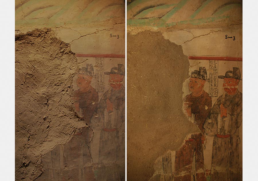 Before (left) and after restoration on No 98 grotto in Mogao Caves, Dunhuang [Photo provided to China Daily]