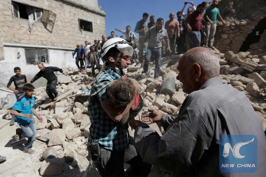 A man carries the body of a dead child at a site hit by airstrike in the rebel-controlled area of Maaret al-Numan town in Idlib province, Syria, June 12, 2016. (Photo/Xinhua)