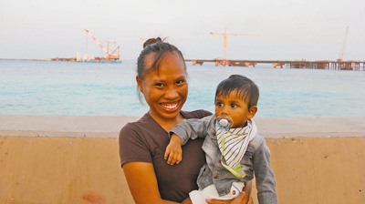 A Maldivian woman carrying a baby visits the construction site of the China-Maldives Friendship Bridge. (Photo by Yuan Jirong from People’s Daily)