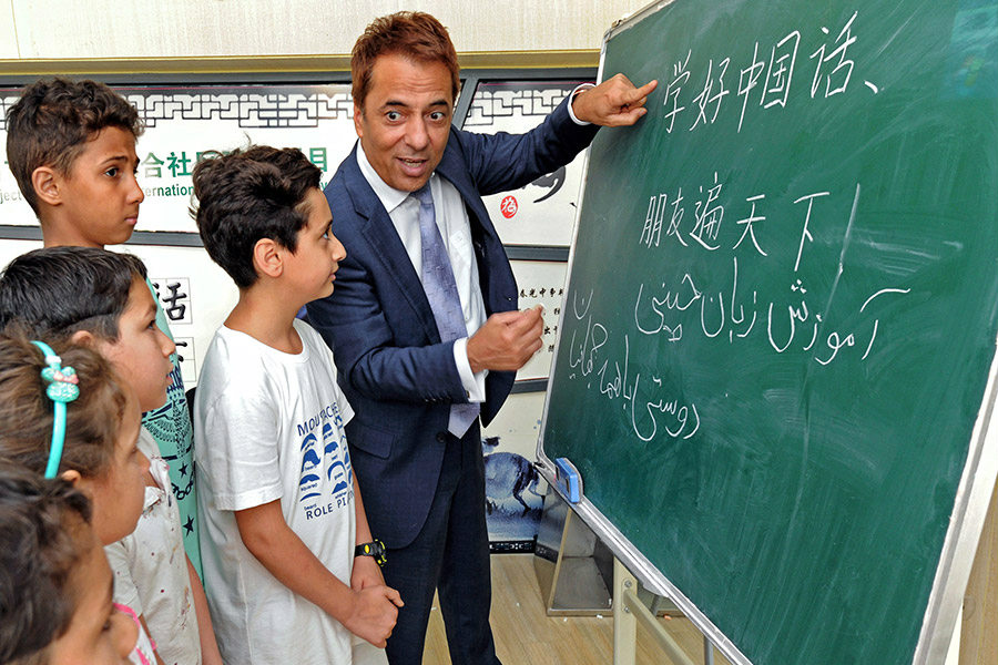 Hamid teaches Chinese to children from Middle Eastern countries, in Yiwu, Zhejiang province, May 9, 2017. [Photo/Xinhua]