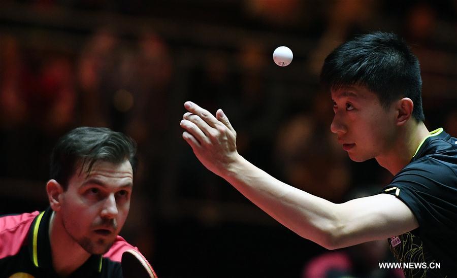 Ma Long (R) of China and Timo Boll of Germany compete against Sharath Kamal Achanta and Sathiyan Gnanasekaran of India during the men's doubles second round match at the 2017 World Table Tennis Championships in Dusseldorf, Germany, May 31, 2017. Ma Long and Timo Boll won 4-1. (Xinhua/Tao Xiyi)