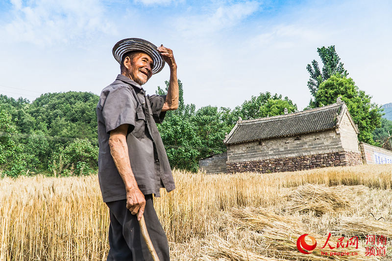 Gao reaping wheat in a field within Yeping Village in Lushan County, Henan province