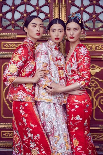 Models wear traditional wedding dresses embroidered in the Chaozhou style, which is one of the top four embroidery styles in China.