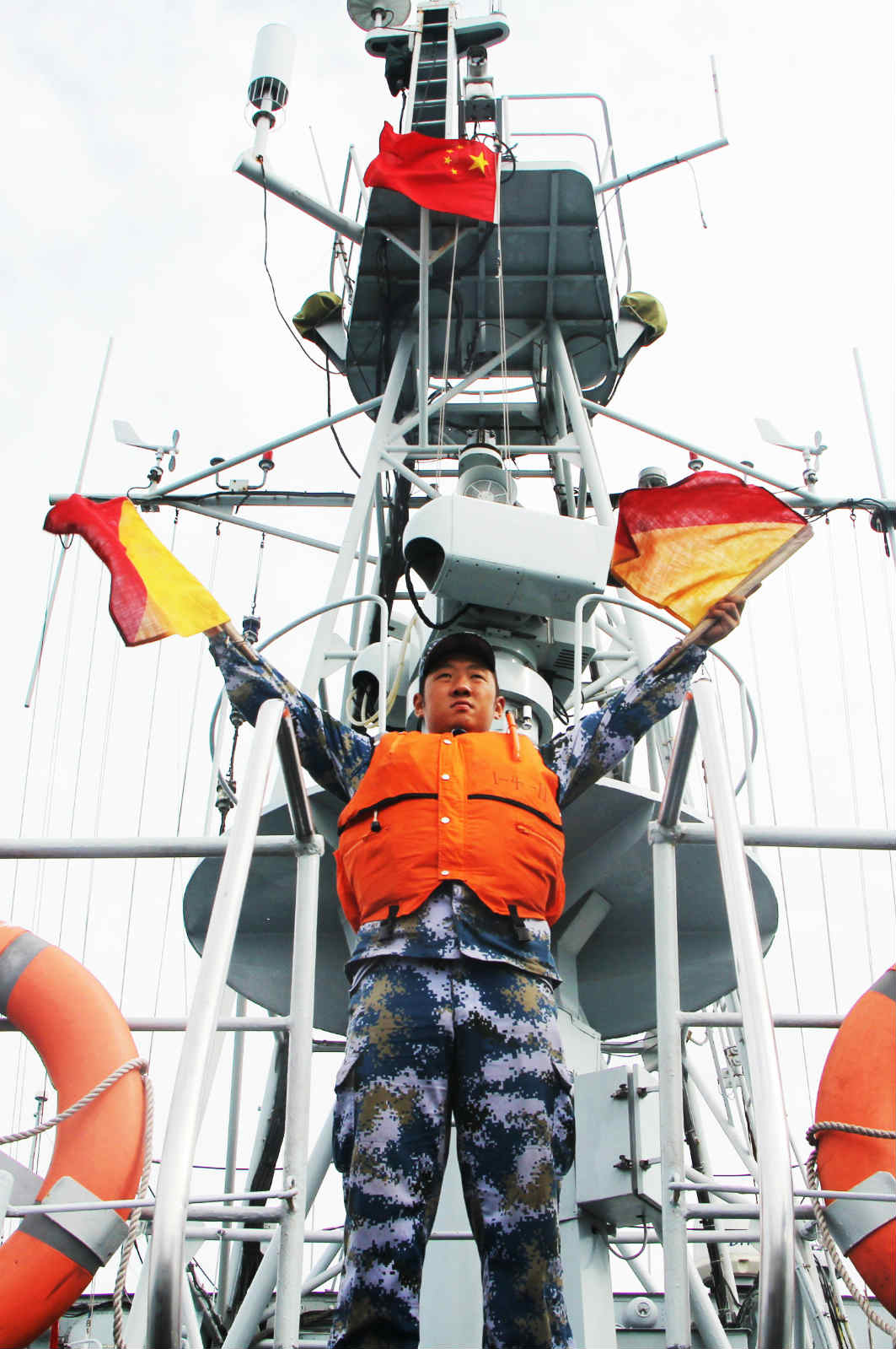 A sailor sends semaphore signals from the missile boat Panyu (Hull 773) during a realistic training exercise in an undisclosed sea area of the South China Sea on June 9, 2017. He is assigned to a frigate flotilla with the South China Sea Fleet under the PLA Navy. (eng.chinamil.com.cn/Photo by Zhang Bin)