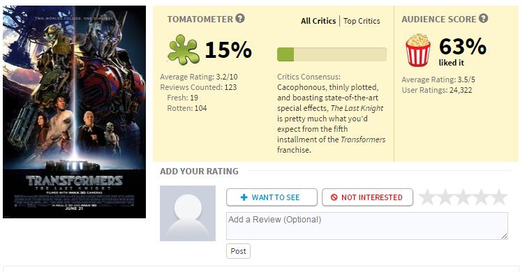 The movie's approval rating on Rotten Tomatoes is currently 15 percent, the worst of the whole franchise.