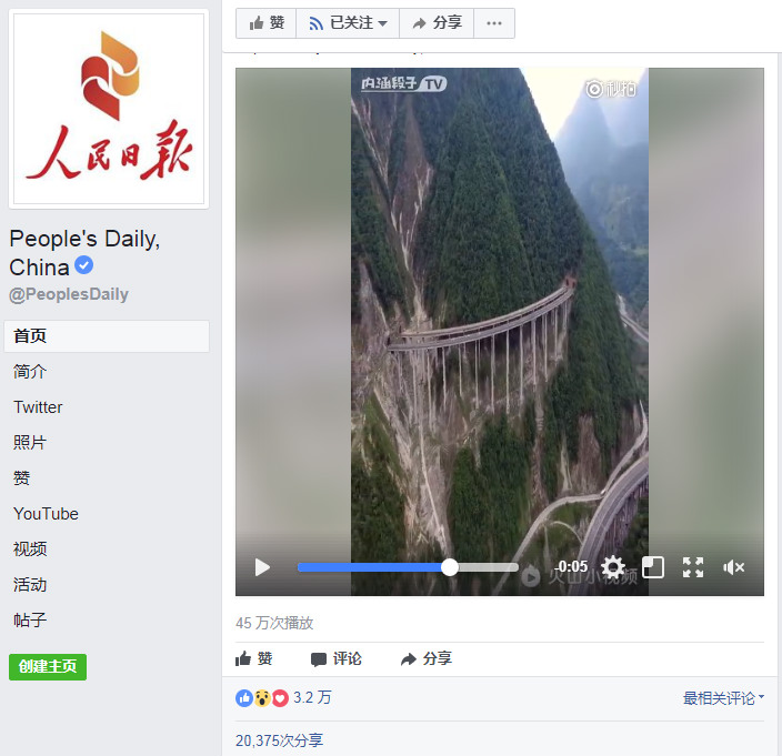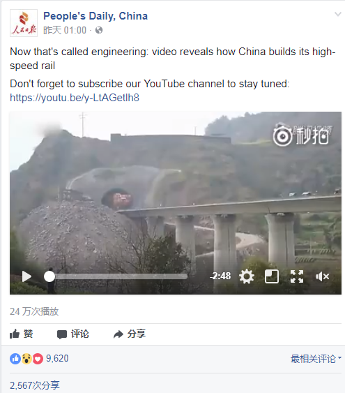 One video revealed the operation of bridge girder erection machine during the building of a high-speed railway in China. Viewed almost a quarter of million times, the video was shared by 2,500 people and received 9,000 likes. “Thanks China for [your] pursuit for talent, knowledge [and] innovation…I think China is already years ahead of America…Again, well done China!” a foreign netizen commented.