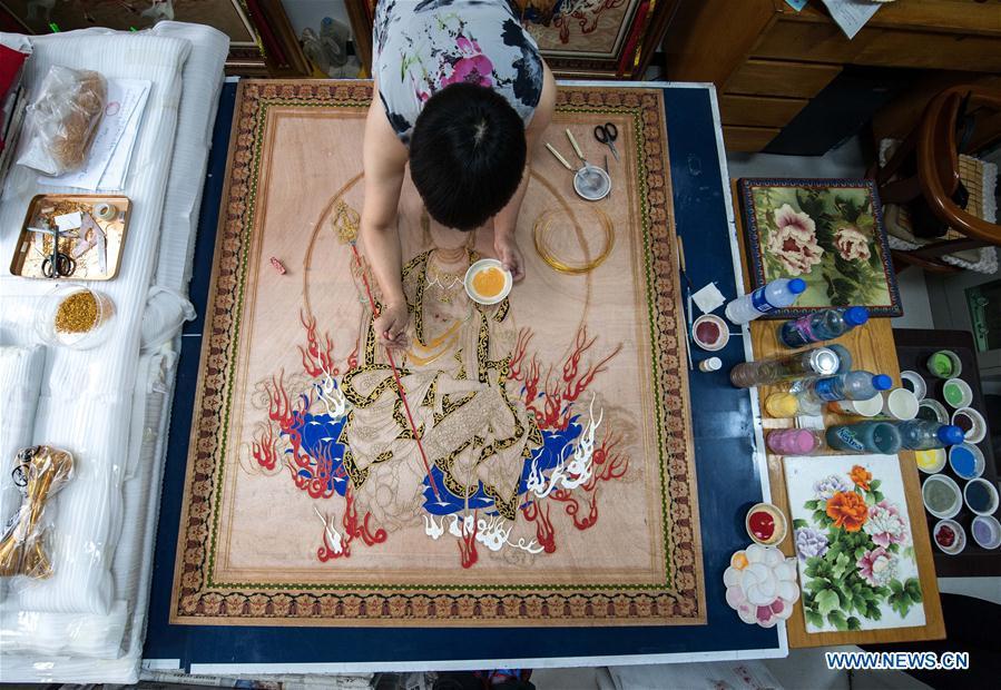 Inheritor of the golden wire color ceramic glaze art Wang Yuping glues different mineral pigments onto the board in Shijiazhuang, capital of north China's Hebei Province, July 18, 2017.(Xinhua/Pu Dongfeng)