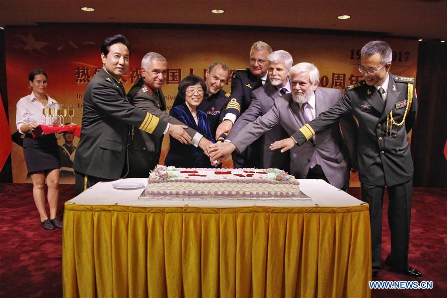 Yang Yanyi (4th L), ambassador and head of the Chinese Mission to the EU, Qi Huajun (2nd L), defense adviser for the Chinese Mission to the EU, General Mikhail Kostarakos (3rd L), Chairman of the European Union Military Committee, and other guests cut a cake to celebrate the 90th anniversary of the founding of the People's Liberation Army of China at a reception in Brussels, Belgium, on July 19, 2017. General Mikhail Kostarakos, Chairman of the European Union Military Committee, congratulated the 90th anniversary of the founding of the People's Liberation Army of China at a reception co-hosted by the Chinese Mission to the EU and Chinese embassy in Belgium. (Xinhua/Han Chong)