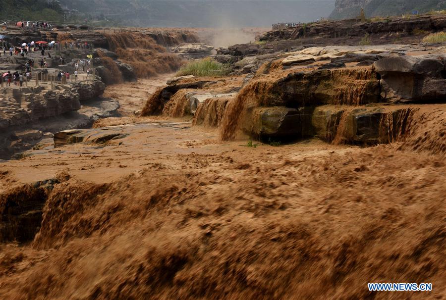 Tourists watch the Hukou Waterfalls on the Yellow River in Linfen, north China's Shanxi Province, July 26, 2017. The Hukou Waterfalls enter a summer flood period due to heavy rainfall in the upstream regions. (Xinhua/Lyu Guiming)