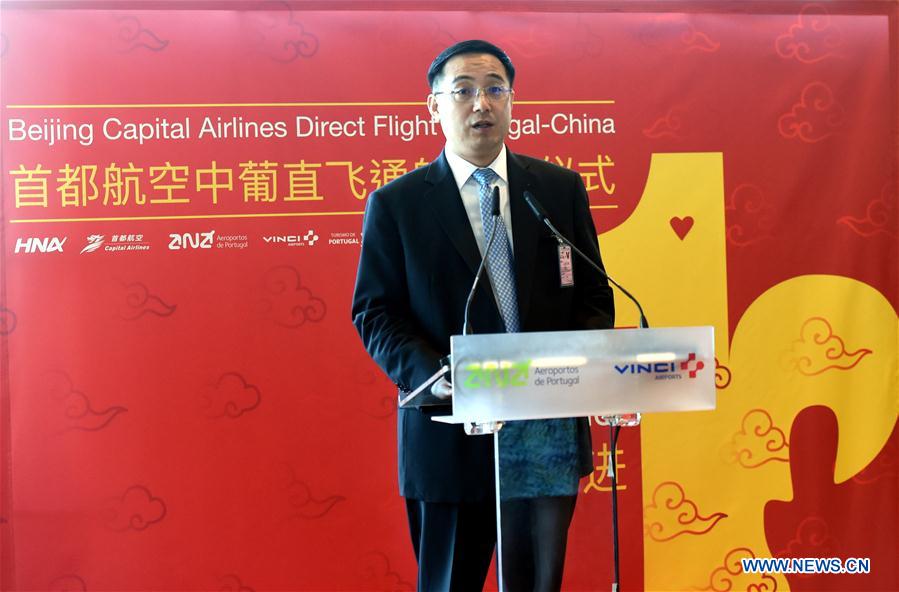 Chinese Ambassador to Portugal Cai Run speaks at the inaugural ceremony of the first direct flight from China's Hangzhou to Portuguese capital Lisbon via Beijing, capital of China on July 26, 2017. The flight landed at the Humberto Delgado Airport, Lisbon on Wednesday. An air route between Hangzhou, Beijing and Lisbon was inaugurated Tuesday, the first direct flight connecting the capitals of China and Portugal. (Xinhua/Zhang Liyun)