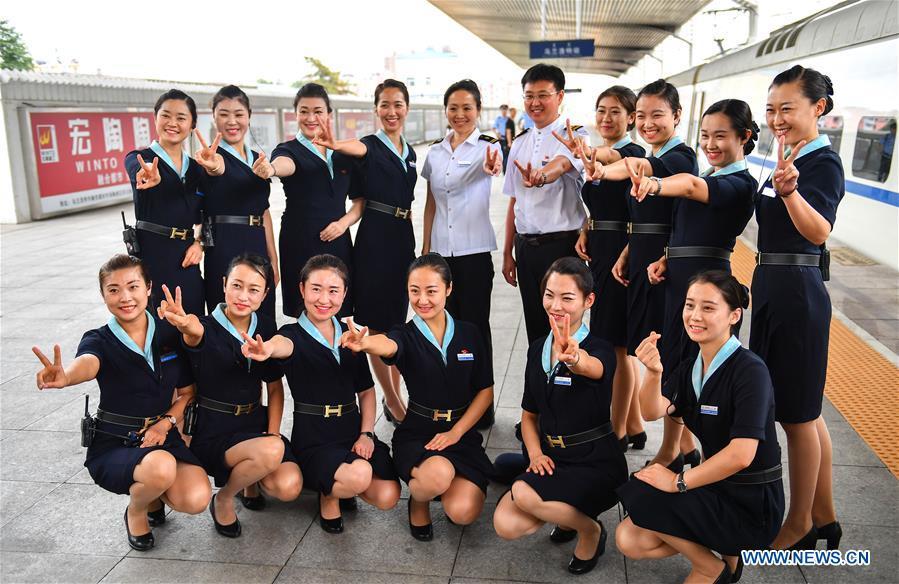 Crew members of the inter-city bullet train pose for a photo in Ulanhot station in Ulanhot of north China's Inner Mongolia Autonomous Regionon July 26, 2017. The 412-km-long railway linking Changchun, Baicheng, both in northeast China's Jilin Province, and Ulanhot in north China's Inner Mongolia Autonomous Region is now in a test operation. (Xinhua/Xu Chang)