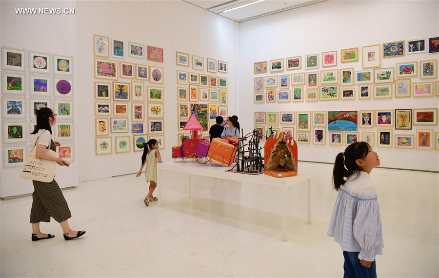 Children and their parents view pictures during a children's art exhibition in Xi'an, capital of northwest China's Shaanxi Province, July 29, 2017. More than 2,900 pieces of works were displayed on the exhibition. (Xinhua/Shao Rui)