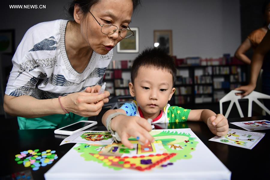 A boy creates a picture with buttons during a children's art exhibition in Xi'an, capital of northwest China's Shaanxi Province, July 29, 2017. More than 2,900 pieces of works were displayed on the exhibition. (Xinhua/Shao Rui)