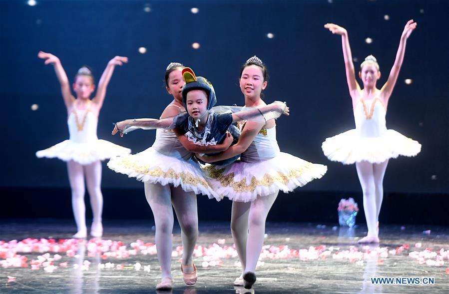 Children competitors dance during the Guangxi zone of a national children's ballet contest in Nanning, capital of the southwest China's Guagnxi Zhuang Autonomous Region, July 30, 2017. The contest kicked off here on Sunday, attracting around 1,000 young dancers of 50 groups in the region. (Xinhua/Zhang Ailin)