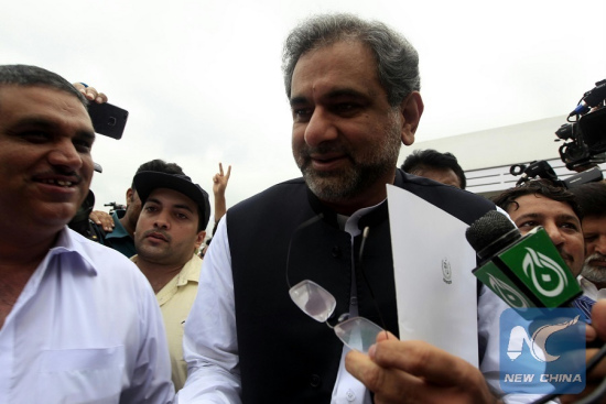 Shahid Khaqan Abbasi talks to media upon his arrival at the National Assembly before the election of the new prime minister of the country in Islamabad, capital of Pakistan, Aug. 1, 2017. (Xinhua/Stringer)