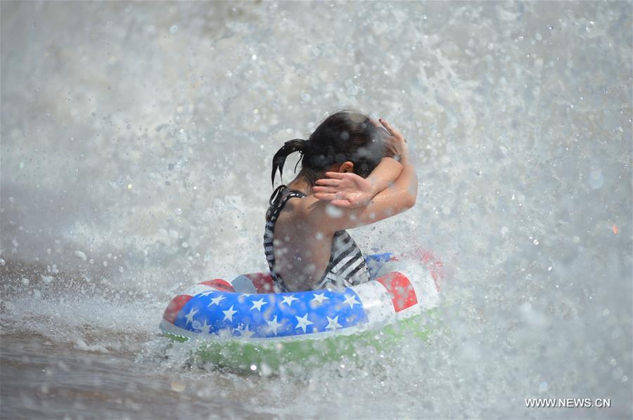 A girl plays with water at the No.1 bathing beach in Qingdao, east China's Shandong Province, Aug. 1, 2017. In this summer, people take different measures to beat the heat across China. (Xinhua/Wang Haibin)