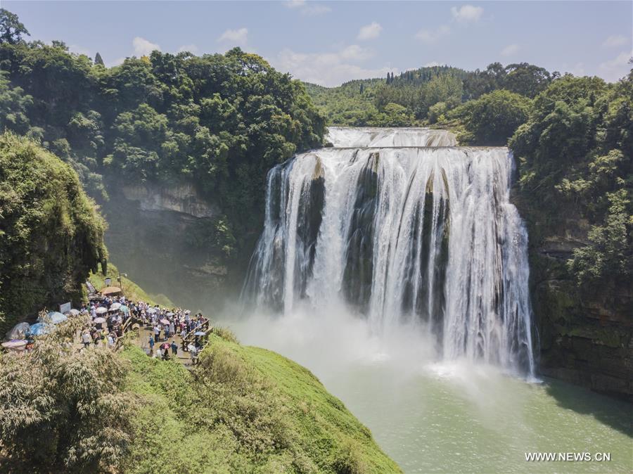 Tourists visit the Huangguoshu waterfall in Anshun City, southwest China's Guizhou Province, Aug. 1, 2017. In this summer, people take different measures to beat the heat across China. (Xinhua/Chen Xi)