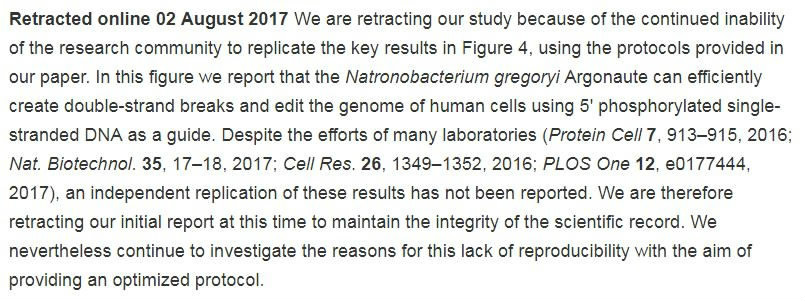 "An independent replication of these results has not been reported," Han said in a note on the Nature Biotechnology website, "We are therefore retracting our initial report at this time to maintain the integrity of the scientific record."