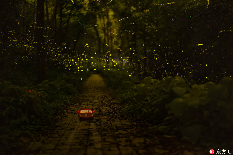 Photos taken on July 17, 2017 show fireflies gathering around a red paper umbrella, lighting up a beautiful summer night at a village in Nanjing, east China's Jiangsu Province. Thanks to recent improvements in the local ecology, fireflies, which hadn't been seen for years, have begun appearing again in the village. [Photo: IC]