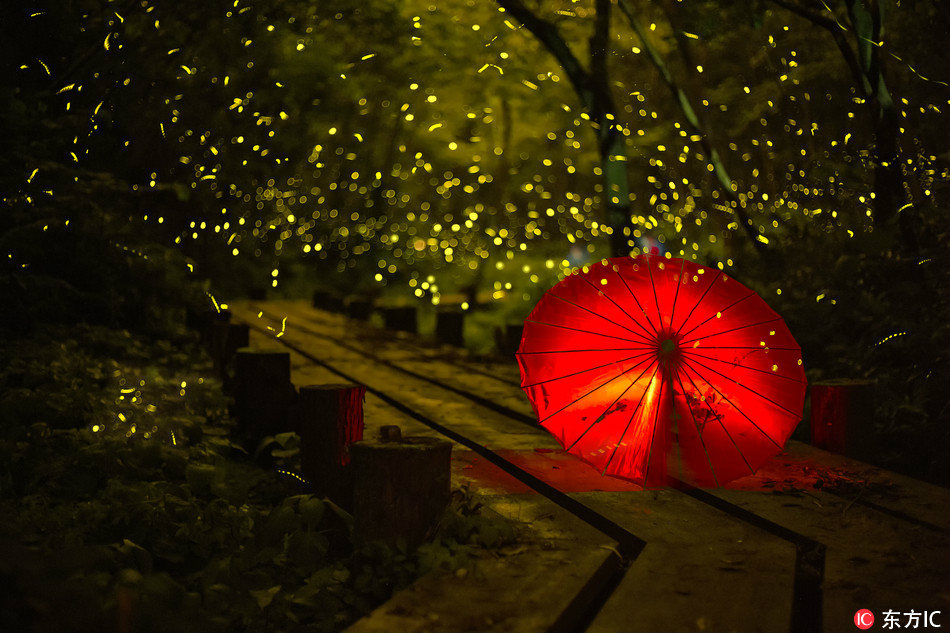 Photos taken on July 17, 2017 show fireflies gathering around a red paper umbrella, lighting up a beautiful summer night at a village in Nanjing, east China's Jiangsu Province. Thanks to recent improvements in the local ecology, fireflies, which hadn't been seen for years, have begun appearing again in the village. [Photo: IC]