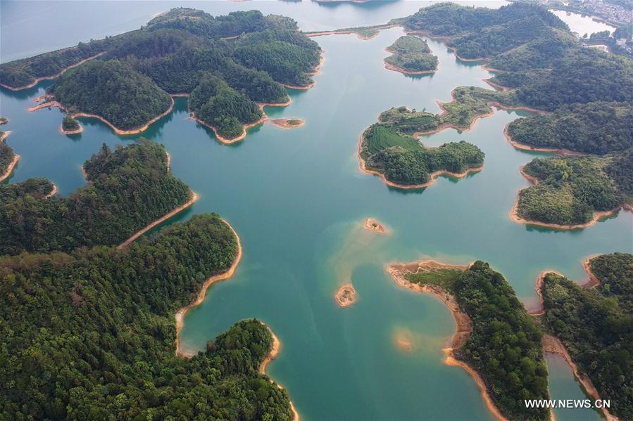 Aerial photo taken on Aug. 7, 2017 shows the scenery of Qiandao Lake, or Thousand-Island Lake, in Chun'an County, east China's Zhejiang Province. The lake covers 573 square kilometers, and is home to 114 known fish species, with an economic value of over 4 billion yuan (600 million U.S. dollars). (Xinhua/Zhang Cheng)