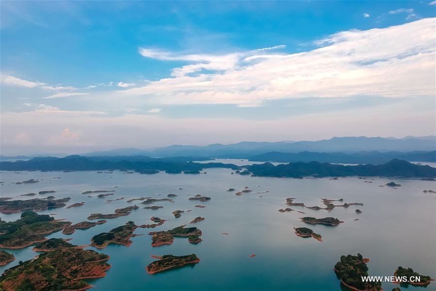 Aerial photo taken on Aug. 7, 2017 shows the scenery of Qiandao Lake, or Thousand-Island Lake, in Chun'an County, east China's Zhejiang Province. The lake covers 573 square kilometers, and is home to 114 known fish species, with an economic value of over 4 billion yuan (600 million U.S. dollars). (Xinhua/Zhang Cheng)