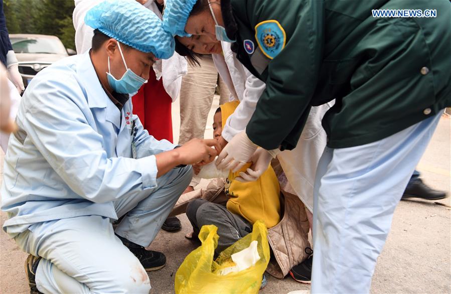 An injured kid receives medical treatment at the InterContinental Resort Jiuzhai Paradise in quake-hit Jiuzhaigou County, southwest China's Sichuan Province, Aug. 9, 2017. A 7.0-magnitude earthquake struck Jiuzhaigou Tuesday night. (Xinhua/Fan Peishen)