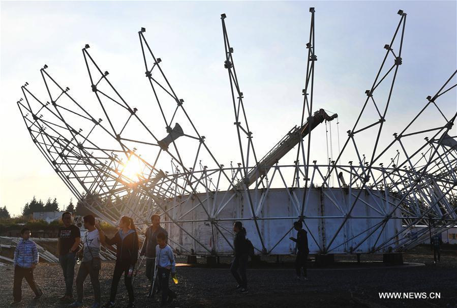Young observers visit a giant telescope under construction during a visit organized by Xinjiang Astronomical Society at Nanshan observation station of Xinjiang Observatory in Urumqi, capital of northwest China's Xinjiang Uygur Autonomous Region, Aug. 13, 2017. Young amateurs gathered to observe the Perseid meteor shower at the observation station which serves as a national science education base. (Xinhua/Wang Fei)