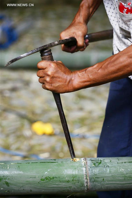 Yang Mingqing, 72, makes a bamboo raft in Fanzhao Village of Nanshao Town in Jianhe County, southwest China's Guizhou Province, Aug. 18, 2017. The brothers, makers of the bamboo raft for several decades, saw its vanish years ago as the new transportation took the lead in the daily life, but they are demanded now to revive the old crafts. In recent years, local tourism industry booms with more tourists curious about the traditional local life including the rafting as the old fashioned transport. (Xinhua/Yang Wenbin)
