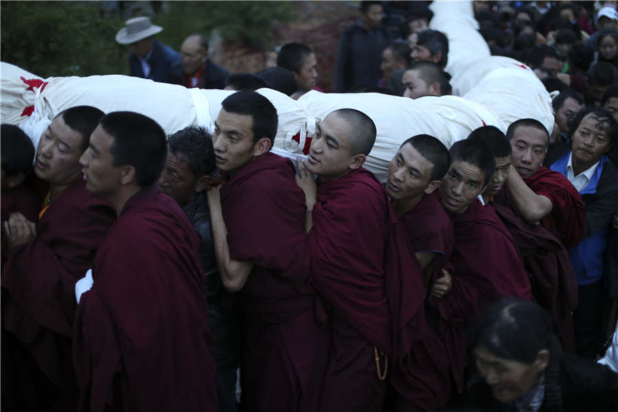 Buddhists and believers carry a large thangka painting of the Buddha for exhibition at Drepung Monastery in Lhasa, capital of Southwest China's Tibet autonomous region, Aug 21, 2017. [Photo by Feng Yongbin/Asianewsphoto]