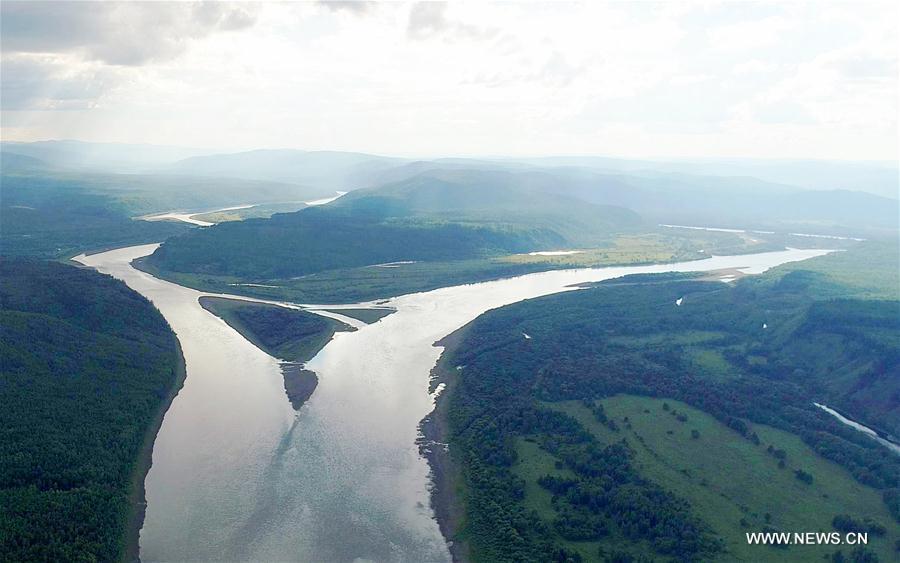Photo taken on Aug. 10, 2017 shows the construction site of a road bridge over the Heilongjiang River at the border of China and Russia. The bridge is over 200 kilometers away from Huma County. The road bridge linking Heihe of northeast China's Heilongjiang Province and the Russian city of Blagoveshchensk is scheduled to open to traffic in 2019. (Xinhua/Wang Song)