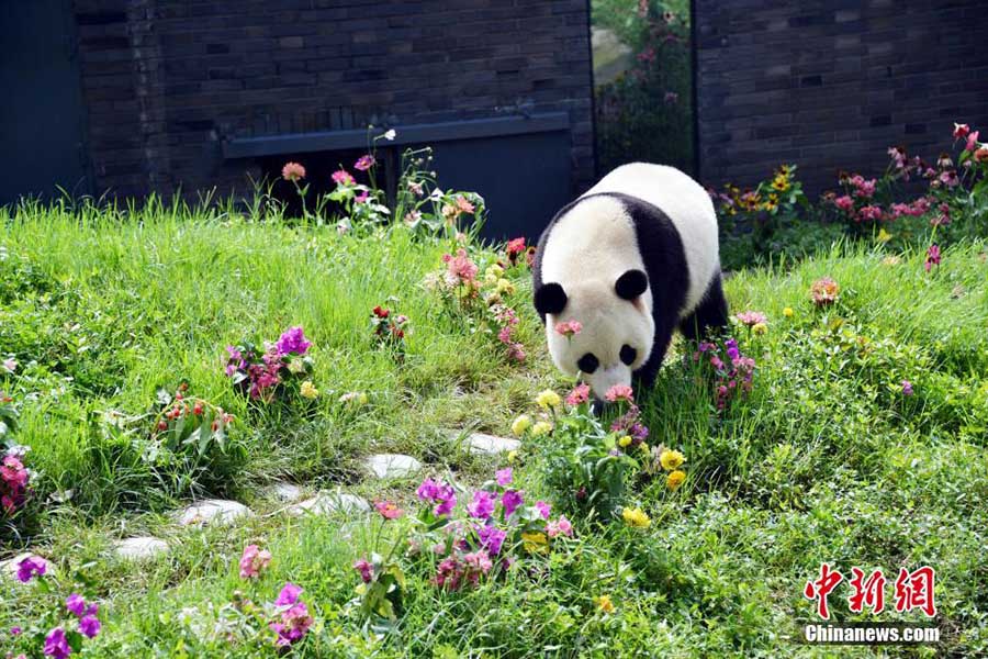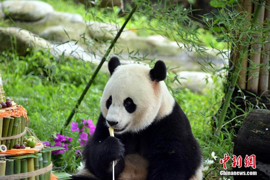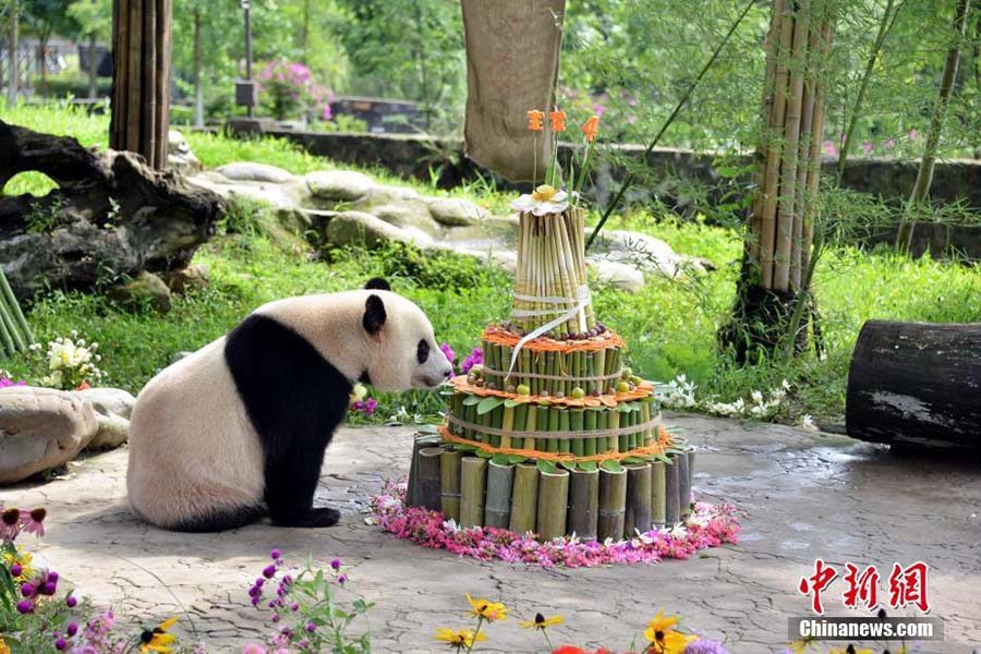 Staff with the Dujiangyan base of the China Conservation and Research Center for Giant Panda prepared a 50-kilogram birthday cake made from bamboo, carrots, steamed buns and apples.