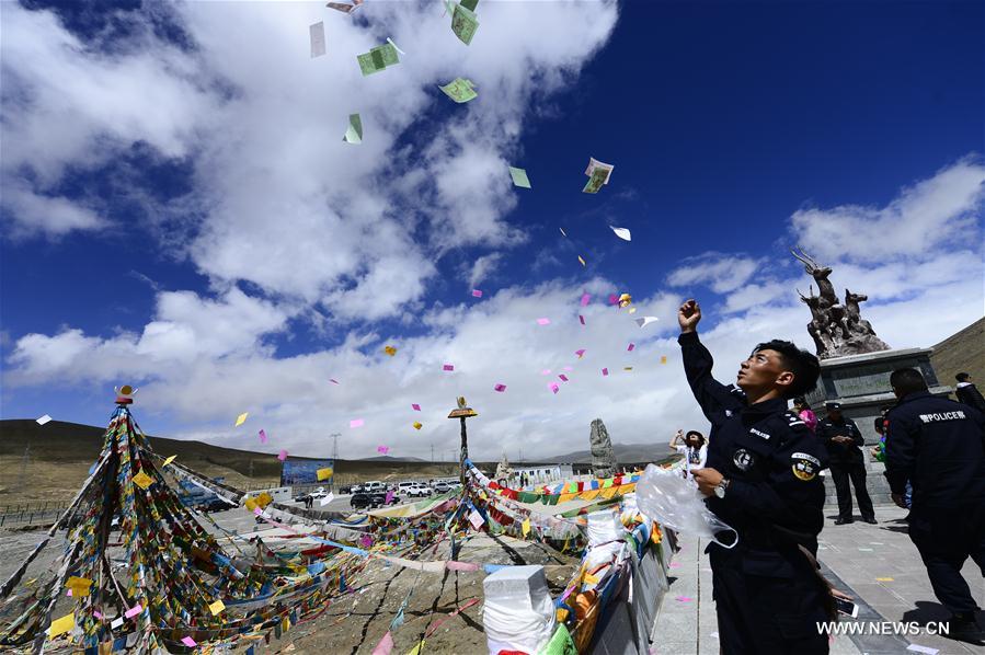 Head of a patrol team Wen Xiu commemorates the martyrs who lost their lives for protecting the environment of Hoh Xil in Yushu Tibetan Autonomous Prefecture, northwest China's Qinghai Province, Aug. 18, 2017. Hol Xil has an average altitude of over 4,600 meters, making it an ideal habitat for Tibetan antelopes, kiangs and other animals. It was enlisted as one of the UNESCO's World Natural Heritages in July 2017. (Xinhua/Zhang Hongxiang)