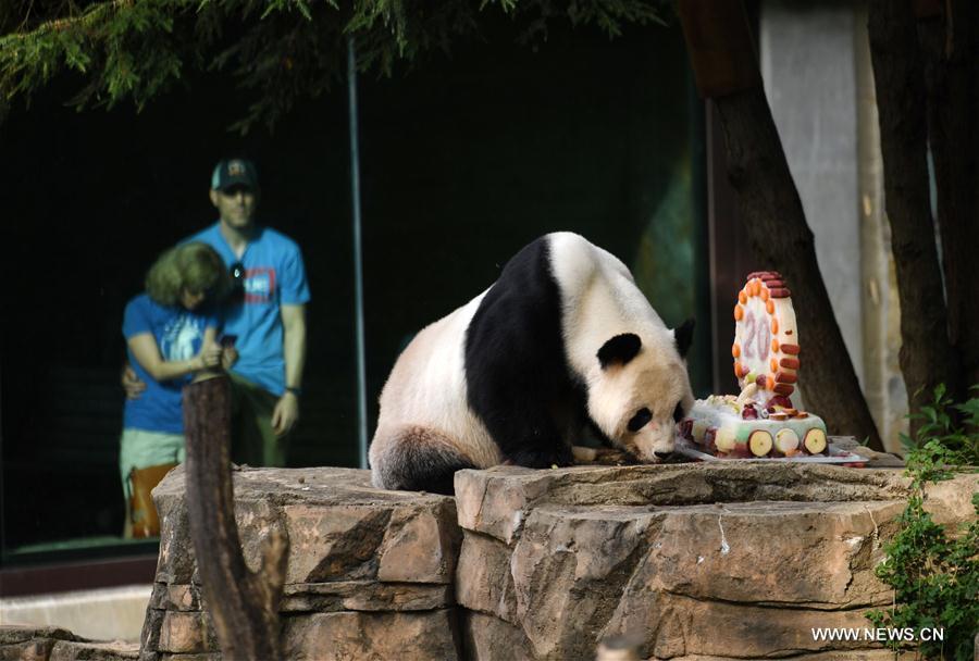 Giant panda Tian Tian enjoys birthday cake during a celebration for its 20th birthday at Smithsonian's National Zoo in Washington D.C., the United States, Aug. 27, 2017. The zoo held a celebration on Sunday for giant panda Tian Tian's 20th birthday. (Xinhua/Yin Bogu)